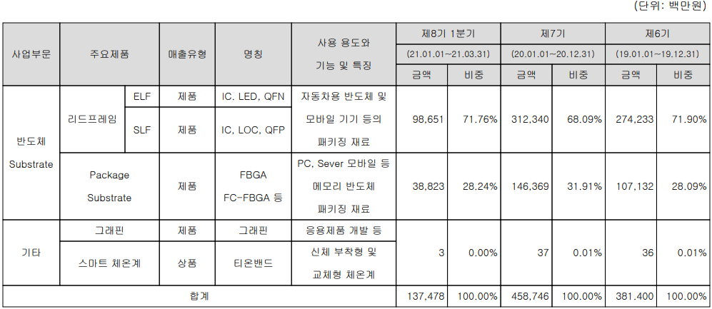 당사는 차량용 반도체 및 모바일 기기 등의 패키징 재료로 사용되는 리드프레임과, PC 및 Server 모바일 등 메모리 반도체 패키징 재료로 사용되는 Package Substrate를 제조, 공급하고 있습니다. 리드프레임은 제품 패턴의 성형 방식에 따라 ELF(Etched IC Lead Frame)과 SLF(Stamped IC Lead Frame)으로 나뉘는데, 지난 1분기 리드프레임의 매출은 987억 원으로 전체 매출의 71.76%를 나타냈습니다. Package Substrate의 경우 388억 원의 매출로 28.24%의 매출 비중을 기록했습니다.