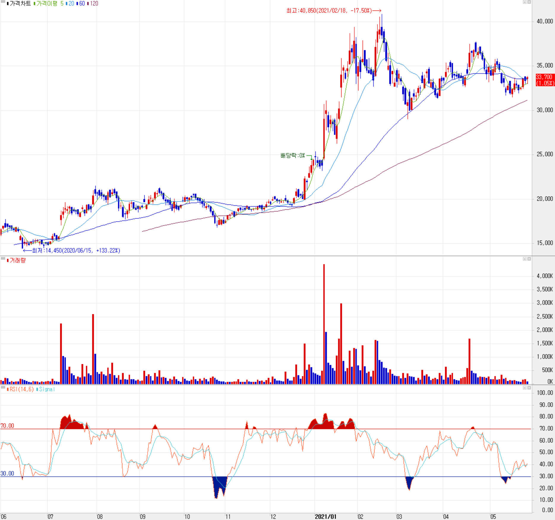 당사의 주가는 올해 초반 차량용 반도체 수요 급증에 따른 공급 부족 급등하기 시작하여 2월 18일 장중 최고가인 40,850원을 기록한 후 조정을 받고 최근에는 3만 원 대 초반에서 주가가 형성되어 있습니다. 최근 5 거래일 연속 순매수하고 있는 기관과 오늘 하루를 제외한 7 거래일 연속 순매수한 외국인 덕에 주가가 반등세를 보이고 있으나, 거래량이 둔화된 상황입니다. 예상 실적 및 차트 소견을 종합한 개인적인 목표주가는 42,000원으로 설정하였습니다.