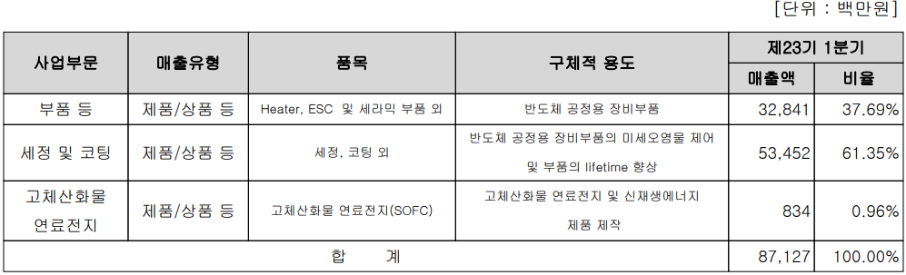 당사는 반도체 공정 중 미세 오염물의 제어 및 수명 향상을 위한 세정, 코팅 사업부문, 반도체 공정에 적용되는 히터, 정전척 및 세라믹 부품 등 부품 사업부문 그리고 연료전지 및 신재생에너지 제조 부문으로 구성되어 있습니다. 지난 1분기 반도체 공정용 부품의 매출은 328억 원으로 전체 매출의 37.69%를 차지하였고, 세정 및 코팅 부문에서는 매출액 535억 원으로 61.35%이 매출 비중을 보였습니다. 또한 올해 1월 1일 물적분할로 신설된 미코파워에서 영위하는 고체산화물 연료전지는 연결 기준 전체 매출의 0.96%에 해당되는 8.3억 원의 매출로 최초로 매출을 일궈냈으며, 후반기부터 매출이 확대될 것으로 전망하고 있습니다.