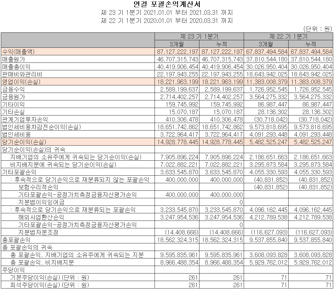 당사의 2021년 1분기 실적은 매출액 871억 원으로 전년 동기 대비 28.4% 증가했고, 영업이익은 182억 워느로 60.1% 증가, 당기순이익은 149억 원을 기록하면서 172.3% 증가했습니다. 세정 및 코팅 사업부문과 세라믹 부품 사업부문 등에서 고른 실적 개선이 있었습니다.