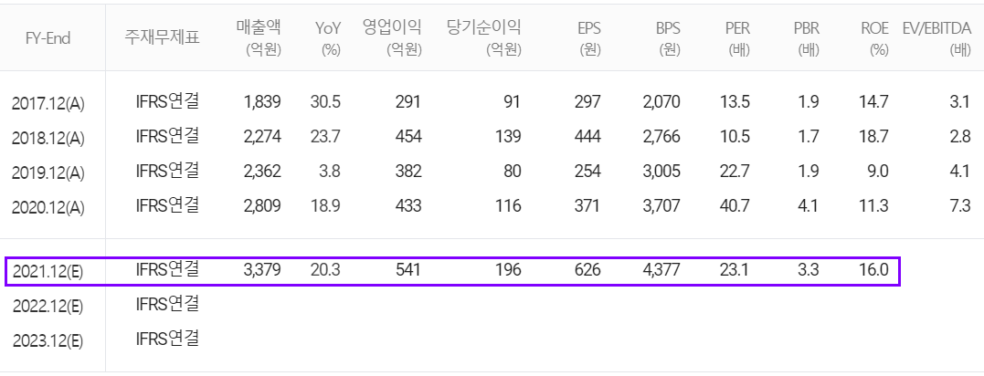 당사의 2021년 컨센서스는 매출액 3,379억 원으로 전년 대비 20.3% 증가하고, 영업이익은 541억 원으로 24.9% 증가할 것으로 추정했습니다.