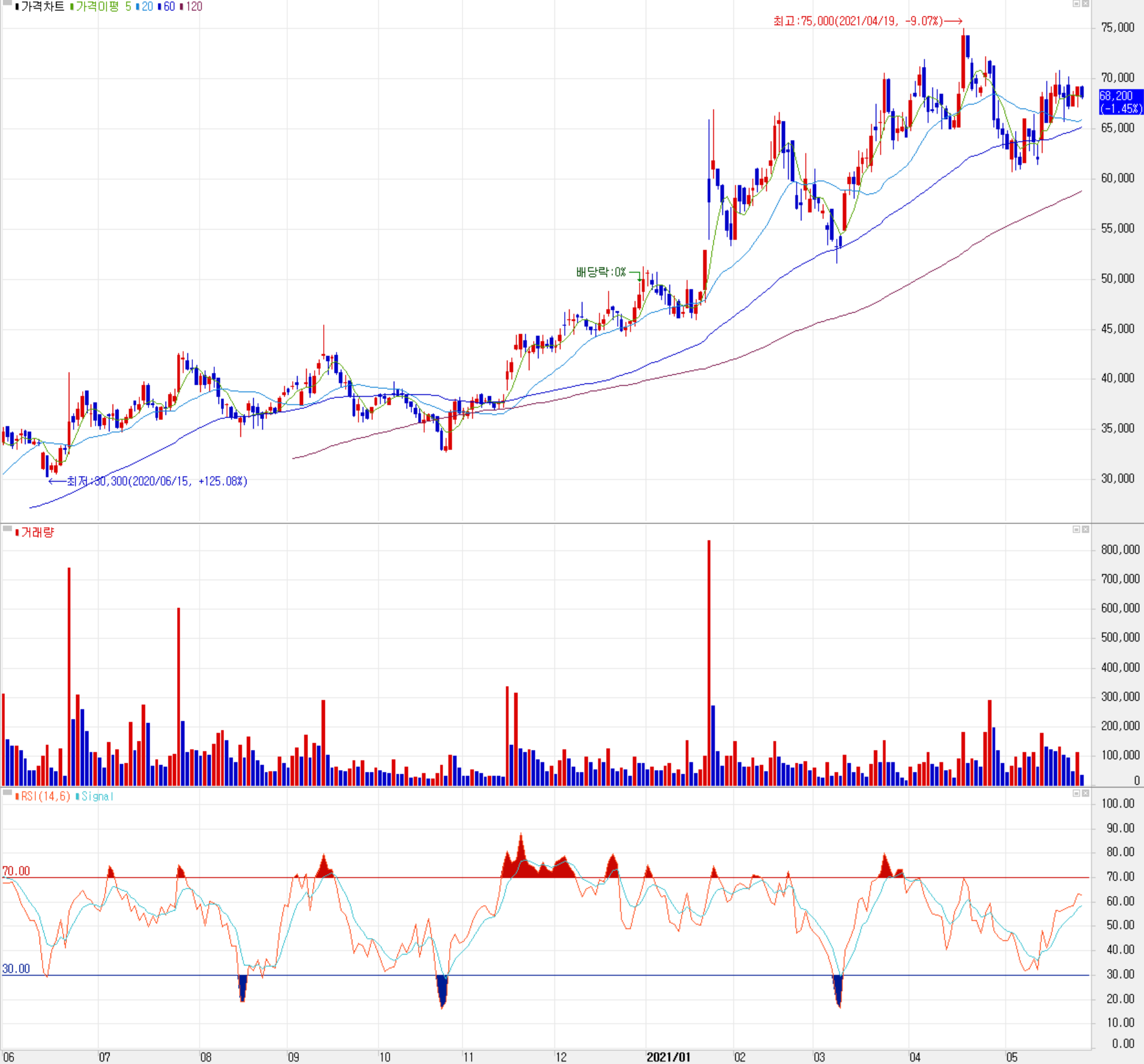 5월 28일 장종료 기준 당사의 주가는 전일보다 1.45% 내린 68,200원에 거래를 마감했습니다. 외국인 비중은 39.85%이며, 시가 총액 6,834억 원으로 코스닥 시총 상위 108위 종목입니다.
