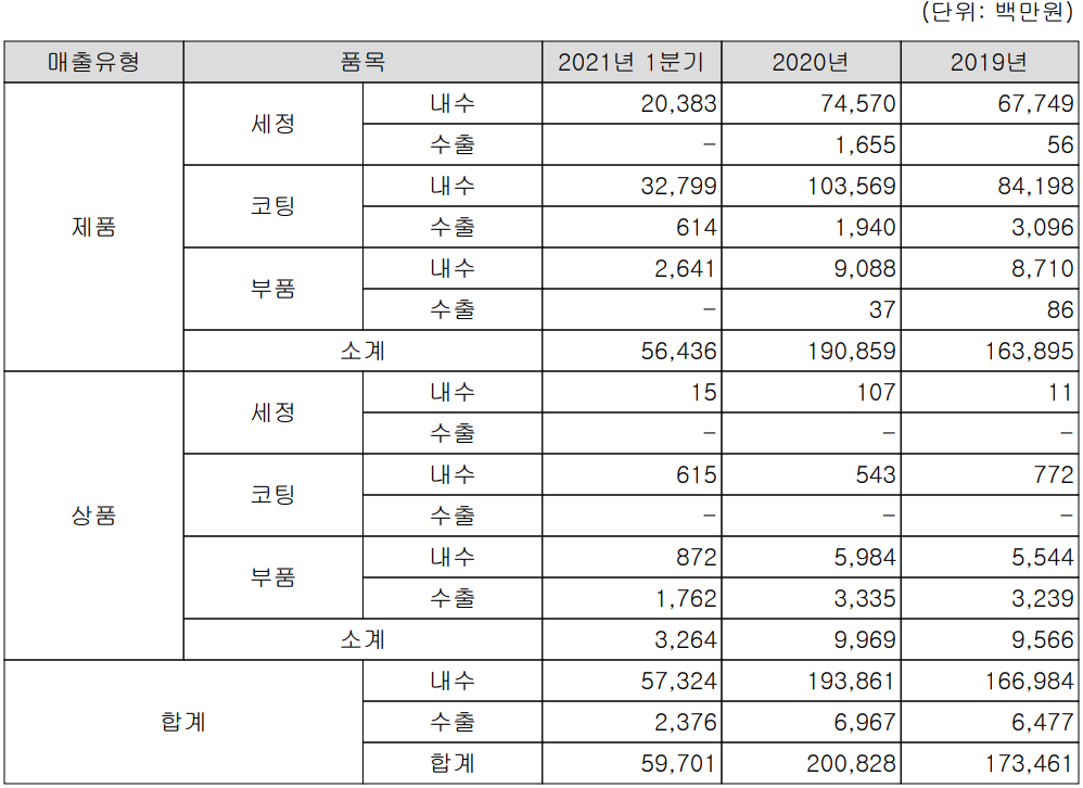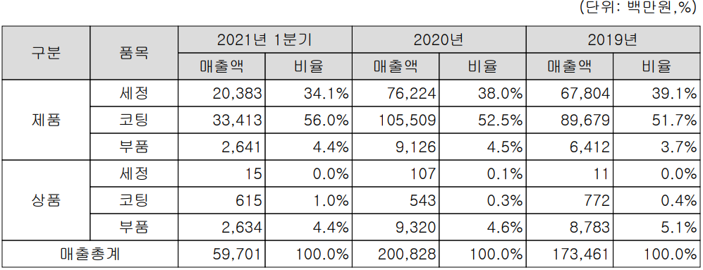당사는 반도체, 디스플레이 및 태양광 칩 제조 공정 중 필수적인 오염제거 및 수명 향상을 위한 코팅 등의 서비스를 제공하며, 반도체 장비용 세라믹 부품을 제조, 공급합니다. 지난 1분기 세정 부문 매출액은 204억 원으로 전체 매출의 34.1% 비중을 차지했으며, 코팅은 340억 원으로 57%의 매출 비중을 나타냈습니다.