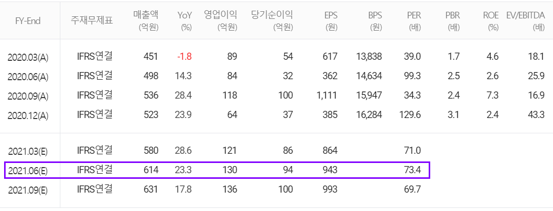 당사의 1분기 컨센서스 대비 실적은 매출과 영업이익 모두 상회하면서 양호한 실적을 거두었습니다. 2분기 예상 실적에서는 매출액 614억 원으로 전년 동기 대비 23.3% 증가하고, 영업이익 130억 원으로 54.8% 증가할 것으로 추정했습니다.