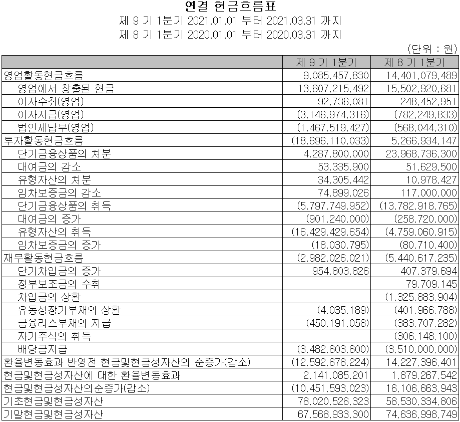 2021년 1분기 영업활동 현금흐름에서는 총 91억 원의 현금이 유입되었으며, 차입금을 조달하여 부채를 상환하고, 배당금을 지급하였습니다. 세정 및 코팅2021년 1분기 말 기준 현금 및 현금성 자산은 676억 원입니다. 세정 및 코팅 관련 수요에 대응하기 위해 설비투자를 진행하면서 유형자산이 증가하였으며, 현금성 자산은 감소하였습니다.