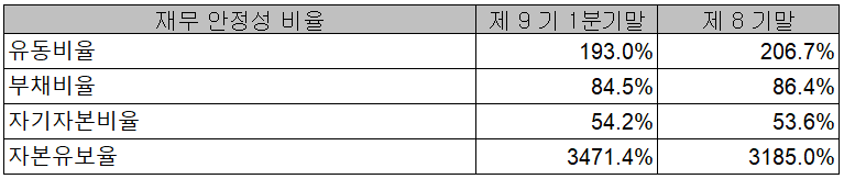 당사의 2021년 1분기 재무 안정성 비율에서는 유동비율 193%, 부채비율 84.5%, 자기자본비율 54.2%, 자본 유보율 3,471.4%를 기록하면서 양호한 재무상태를 유지하고 있습니다.