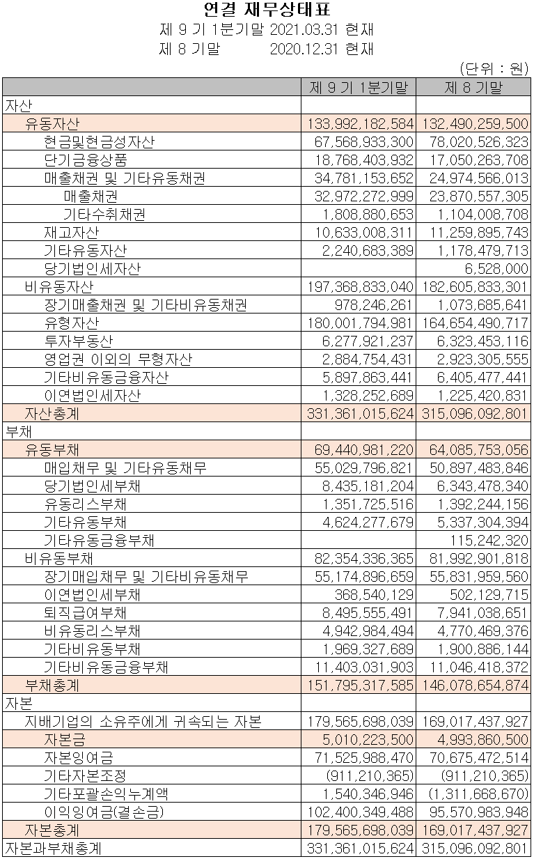지난 1분기 자산총계는 전기보다 5.2%(163억 원) 늘어난 3,314억 원으로 매출 채권과 유형자산의 증가에 기인합니다. 부채는 3.9%(57억 원) 증가한 1,518억 원으로 매입채무의 증가가 주된 요인입니다. 당기 이익의 증가에 따라 자기 자본도 6.2% 증가하면서 1,796억 원을 기록했습니다.