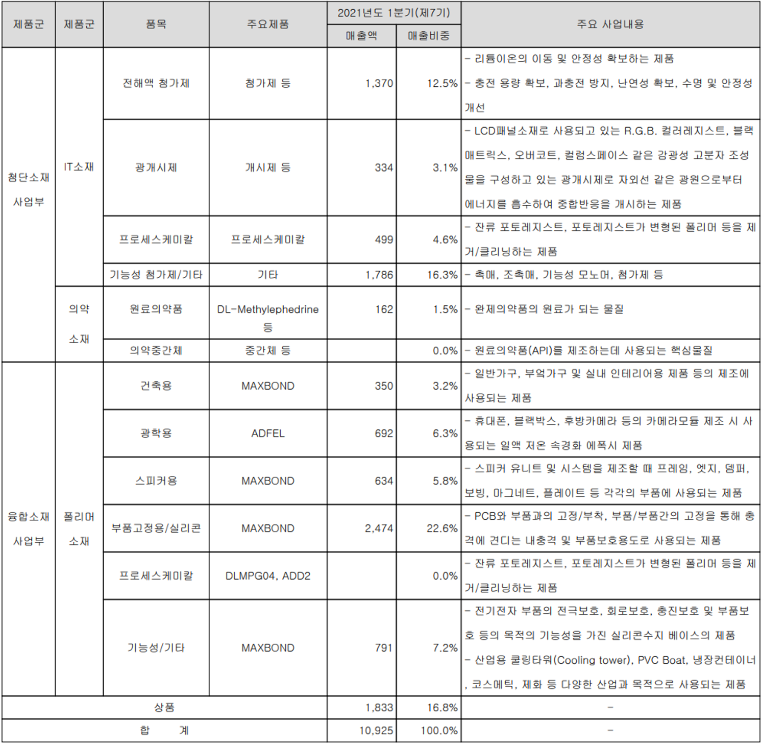 당사은 2차전지, 디스플레이 및 반도체 공정에 사용되는 소재와 의약 소재를 제조하는 첨단소재 사업부문과 건축, 광학 및 실리콘 등 융합소재 사업부문으로 구성되어 있습니다. 지난 1분기 2차전지에 사용되는 전해액 첨가제의 매출은 13.7억 원으로 전체 매출의 12.5%를 차지하였고, 반도체 포토레지스트 공정에 사용되는 프로세스 케미칼은 4.99억 원으로 4.6%의 매출 비중을 나타냈습니다. 폴리머 소재인 PCB 고정용 등에 사용되는 실리콘은 24.7억 원의 매출로 전체 매출의 22.6%를 차지하였습니다.