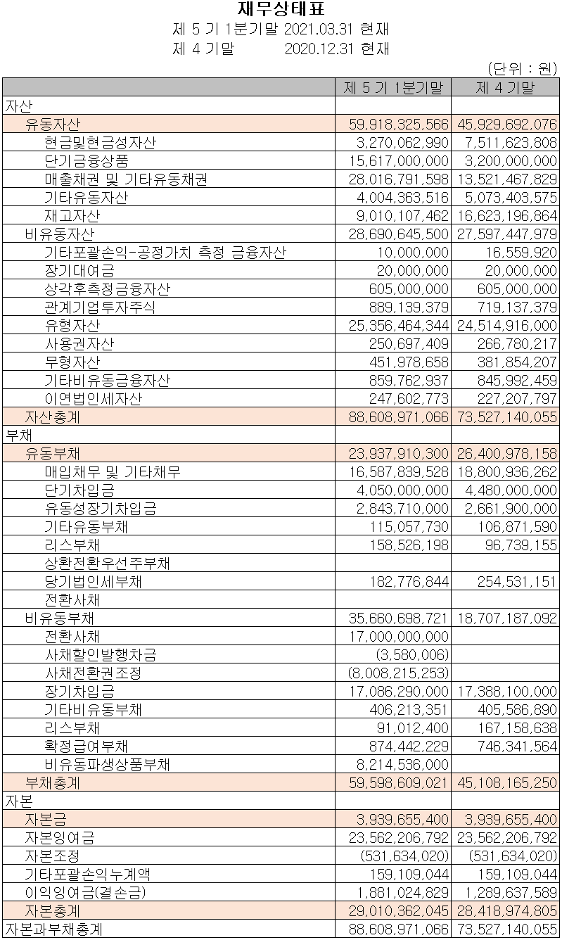 당사의 지난 1분기 말 기준 자산총계는 전기보다 20.5%(151억 원) 증가한 886억 원으로 현금 및 현금성 자산, 단기금융상품, 매출 채권 및 유형 자산의 증가가 주된 요인입니다. 부채는 32.1%(145억 원) 증가한 596억 원으로 170억 원 규모의 전환사채에 기인합니다.