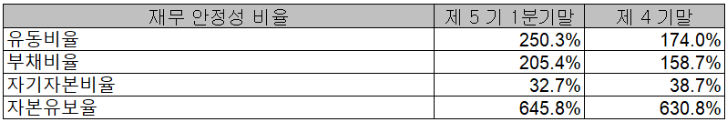 지난 1분기 말 기준 재무 안정성 비율에서는 유동비율 250.3%, 부채비율 205.4%, 자기자본비율 32.7%, 자본 유보율 645.8%를 기록하였습니다. 부채비율이 많이 증가하였으나 전환사채 발행에 시너지아이비(IB)투자의 투자 유치로 인해 170억 원 규모의 자금 조달에 성공하였습니다.