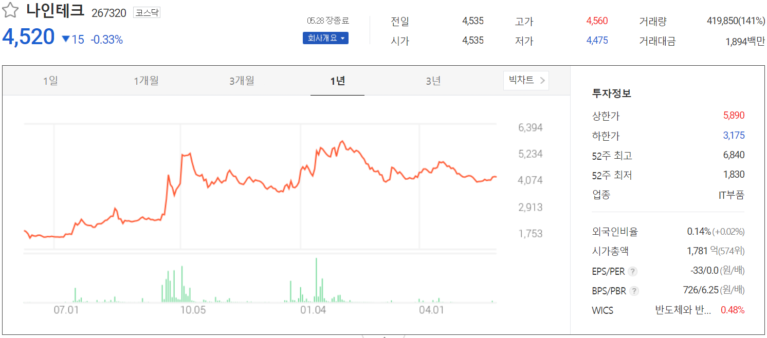 5월 28일 장 종료 기준 당사의 주가는 전 거래일보다 0.33% 내린 4,520원에 거래를 마감했습니다. 외국인 비중은 0.14%이며, 시가 총액 1,781억 원으로 코스닥 시총 574위 종목입니다.