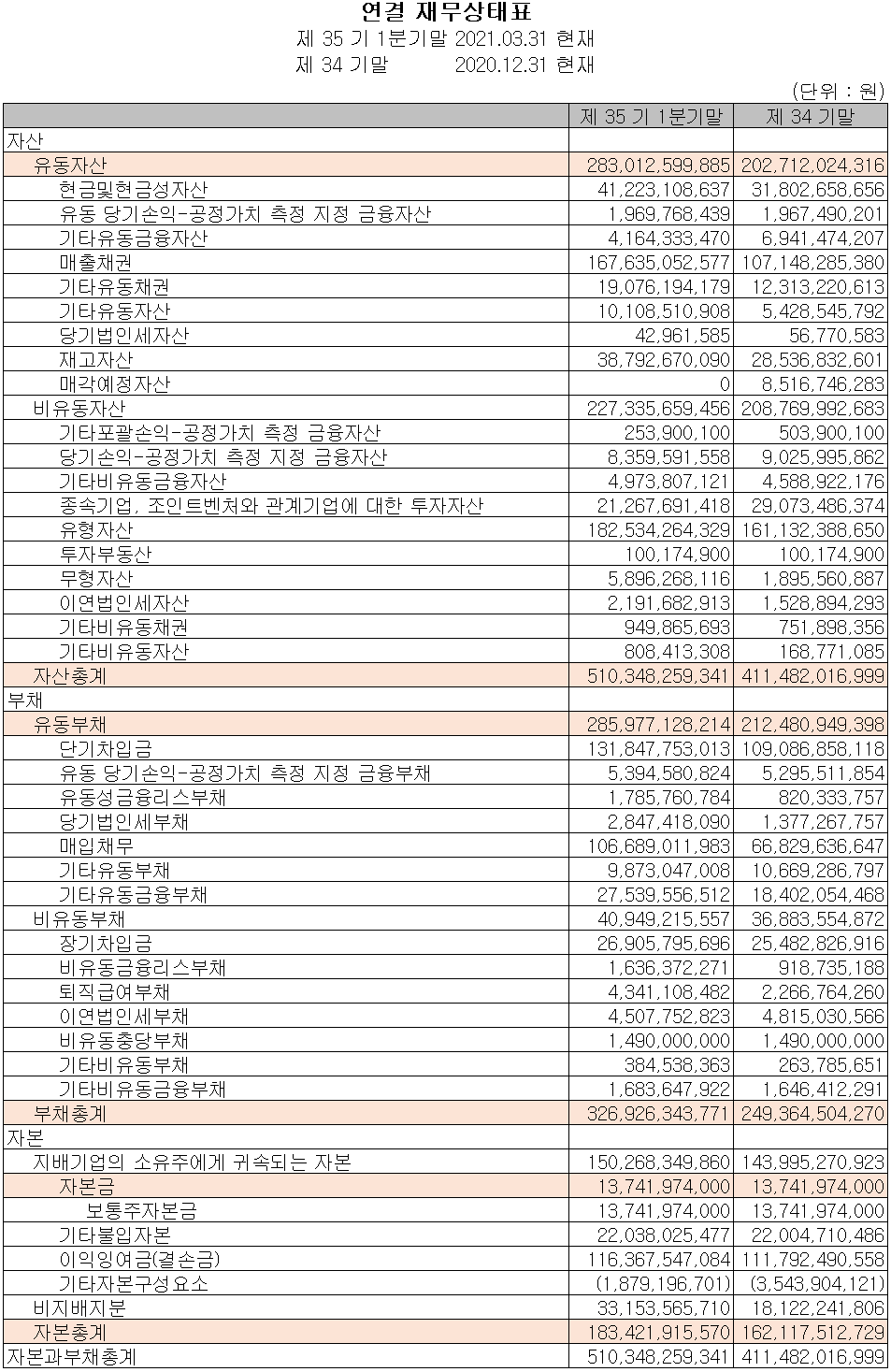 지난 1분기 당사의 자산총계는 전기보다 24%(989억 원) 증가한 5,103억 원으로 현금 및 현금성 자산, 매출 채권 및 재고 자산의 증가에 기인합니다. 부채는 전기보다 31.1%(776억 원) 증가한 3,269억 원으로 차입금 및 매입채무의 증가에 따른 것입니다. 당기 말 자본총계는 이익의 증가에 따라 213억 원이 증가한 1,834억 원을 기록했습니다.