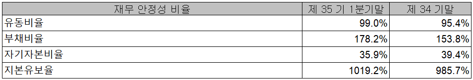당사의 2021년 1분기 말 기준 재무 안정성 비율에서는 유동비율 99%, 부채비율 178.2%, 자기 자본비율 35.9%, 자본 유보율 1,019.2%를 기록하면서 2차전지 등 BA사업부문에 대한 설비 투자로 부채비율이 증가하고 있으나 그에 따른 실적이 성장세에 있으므로 점차 재무상태가 개선될 것으로 예상됩니다.