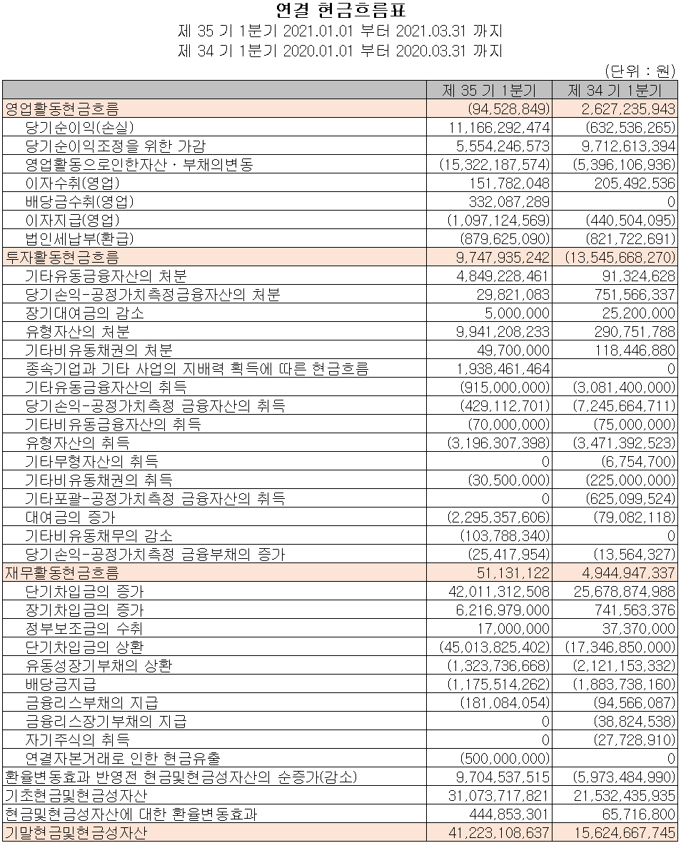 지난 1분기 영업활동 현금흐름은 전환상환우선주부채, 금융리스부채 등의 증가로 0.94억 원의 현금이 유출되었으며, 장단기 차입금을 조달하여 부채를 상환하고, 배당금을 지급하였으며 유형자산의 취득이 있었습니다. 2021년 1분기 말 기준 현금 및 현금성 자산은 전년 동기 대비 256억 원이 증가한 412억 원입니다.