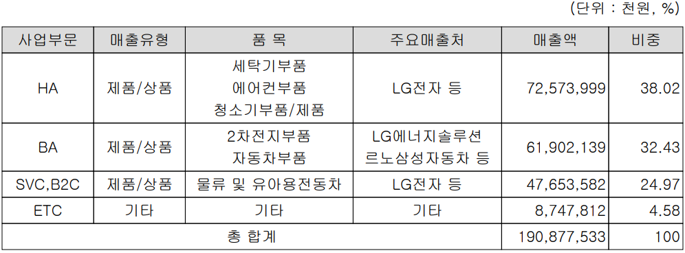 당사는 글로벌 전자기기 제조업체인 LG전자의 Top EMS(전자제품 위탁생산) 업체로서 주요 가전제품인 세탁기, 에어컨, 청소기 등의 부품을 제조하는 HA(Home Appliance) 사업부문과 2차전지 및 자동차 부품을 제조하는 BA 사업부문 그리고 물류 및 유아용 전동차를 제조하는 SVS, B2C 사업부문으로 구성되어 있습니다. 지난 1분기 당사의 HA 사업부문 매출은 726억 원으로 전체 매출의 38.02%를 차지하였으며, BA 사업부문은 619억 원으로 32.43%의 매출 비중을 보였고, SVC 및 B2C 사업부문에서는 477억 원으로 24.97%의 매출을 기록했습니다.
