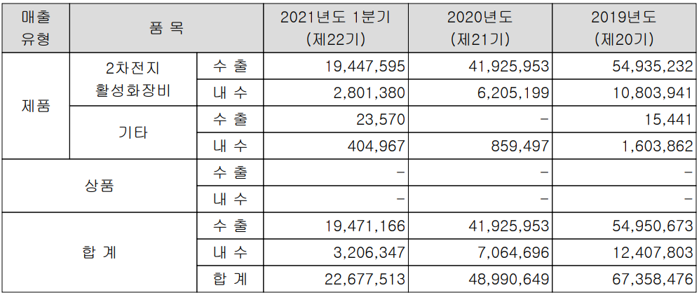 당사의 주력 사업인 2차전지 활성화 장비 및 기타 제품이 있으나 활성화 장비의 매출이 98% 이상을 차지하고 있으며, 지난 1분기 수출과 내수의 비중은 각각 85.9%, 14.1%를 나타냈습니다.