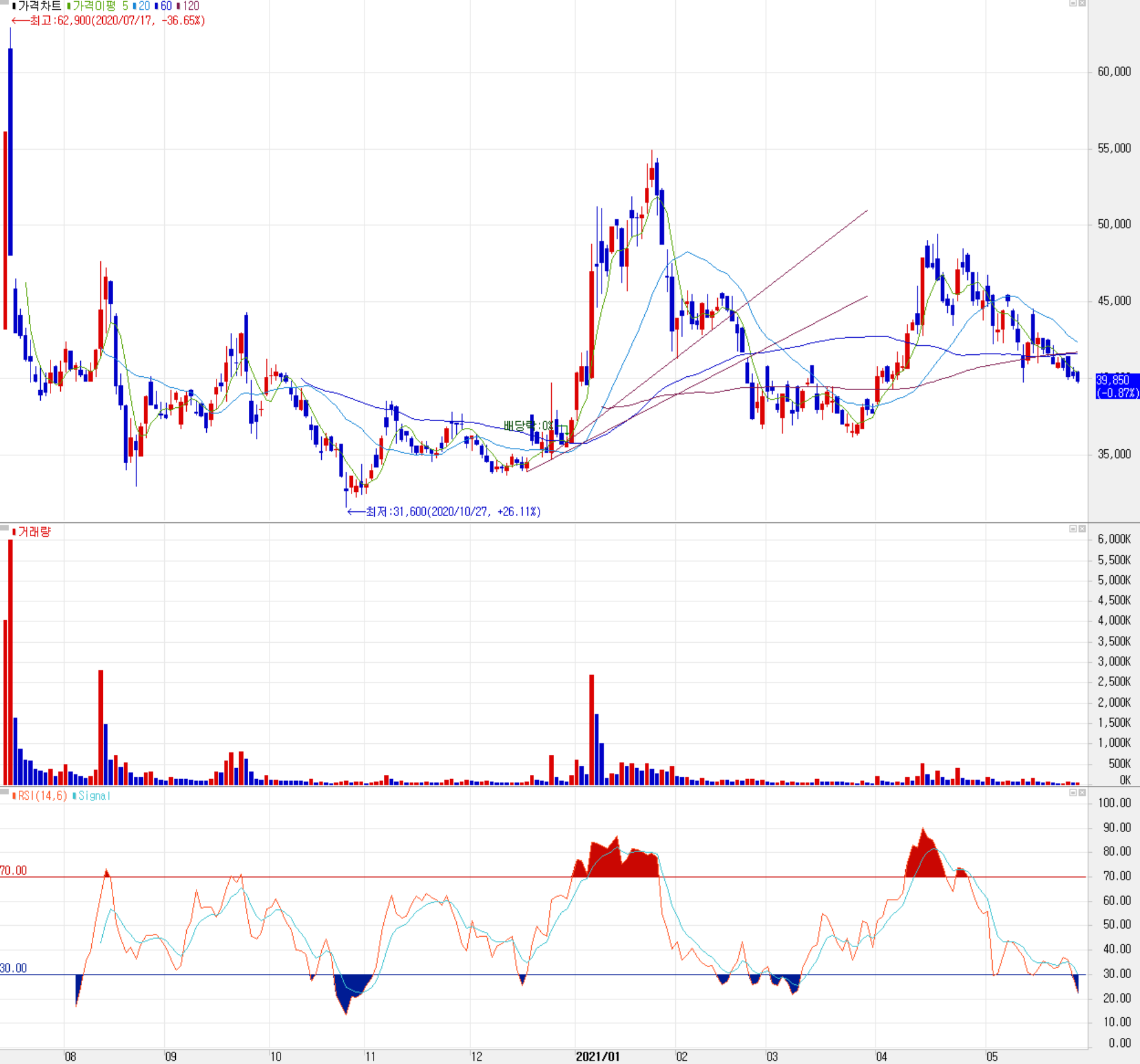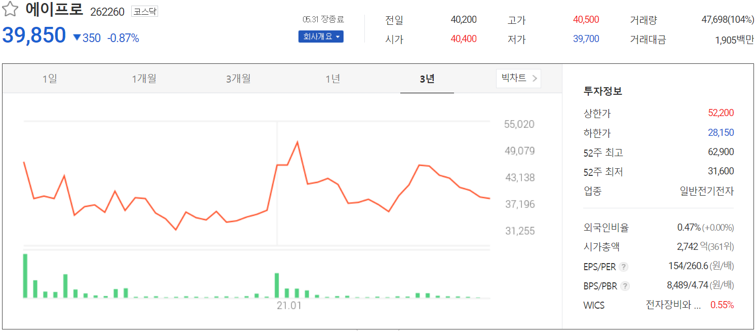 5월 31일 장 종료 기준 당사의 주가는 전 거래일보다 0.87% 내린 39,850원에 거래를 마쳤습니다. 외국인 비중은 0.47%이며, 시가 총액은 2,742억 원으로 코스닥 시총 상위 361위 종목입니다.