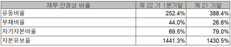 당사의 지난 1분기 재무 안정성 비율에서는 유동비율 252.4%, 부채비율 44%, 자기자본비율 69.5%, 자본 유보율 1,441.3%를 기록하면서 안정적인 재무상태를 유지하고 있습니다.