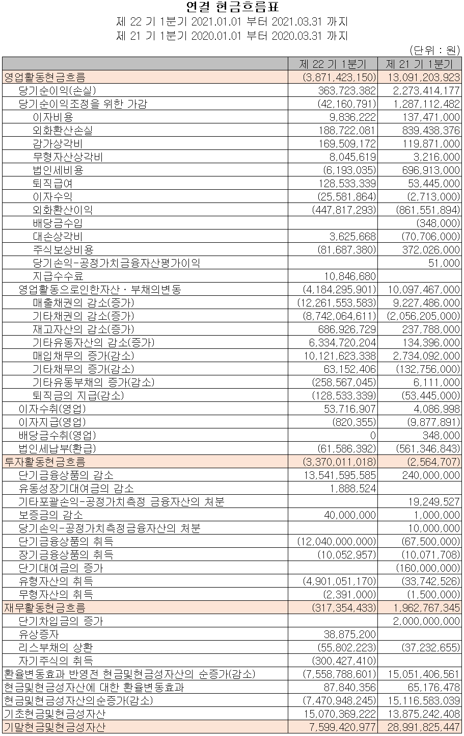 당사의 2021년 1분기 영업활동 현금흐름은 39억 원의 현금이 유출되었으며, 부채를 상환하였고, 자기 주식을 취득하였습니다. 또한 전방산업의 수요 증가에 따른 유형자산에 투자를 하였습니다. 2021년 1분기 말 기준 현금 및 현금성 자산은 전년 동기 대비 214억 원이 감소한 76억 원입니다.