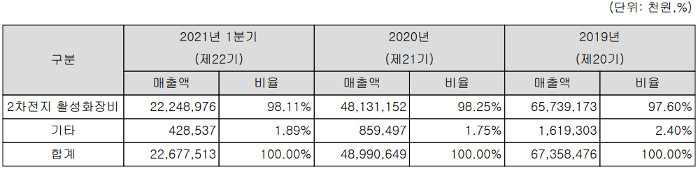 당사의 주력 사업인 2차전지 활성화 장비 및 기타 제품이 있으나 활성화 장비의 매출이 98% 이상을 차지하고 있으며, 지난 1분기 수출과 내수의 비중은 각각 85.9%, 14.1%를 나타냈습니다.