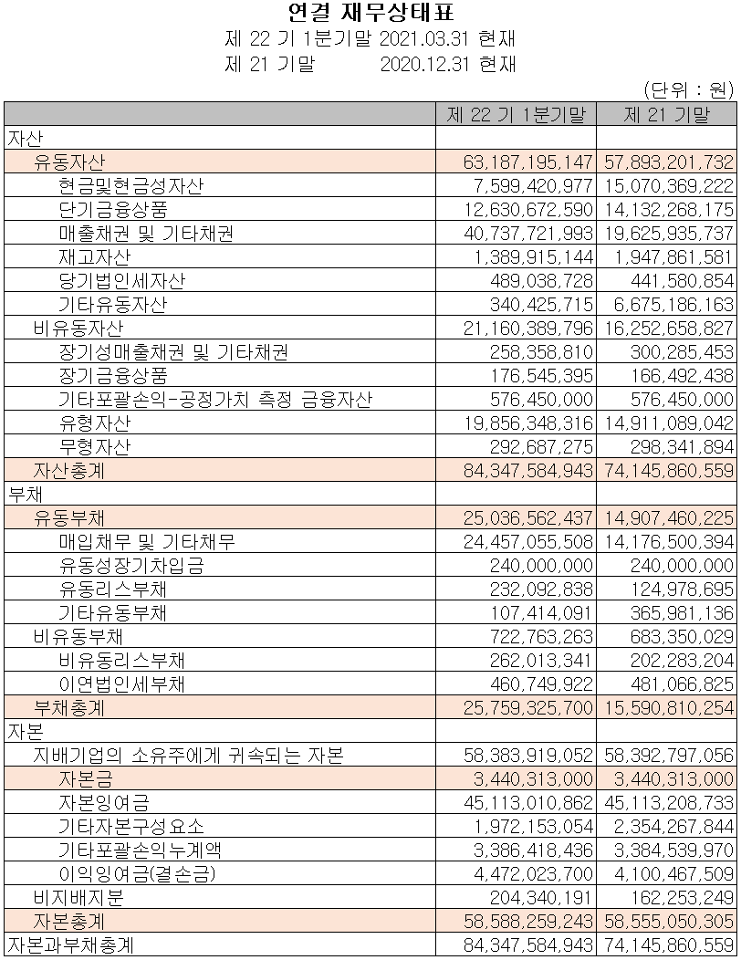 지난 1분기 자산총계는 전기보다 13.8%(102억 원) 증가한 843억 원으로 매출채권 및 유형자산의 증가에 기인합니다. 부채는 전기보다 65.2%(102억 원) 증가한 258억 원으로 매입채무 및 ㅅ러비 투자에 따른 리스 부채의 증가가 주요 요인입니다.