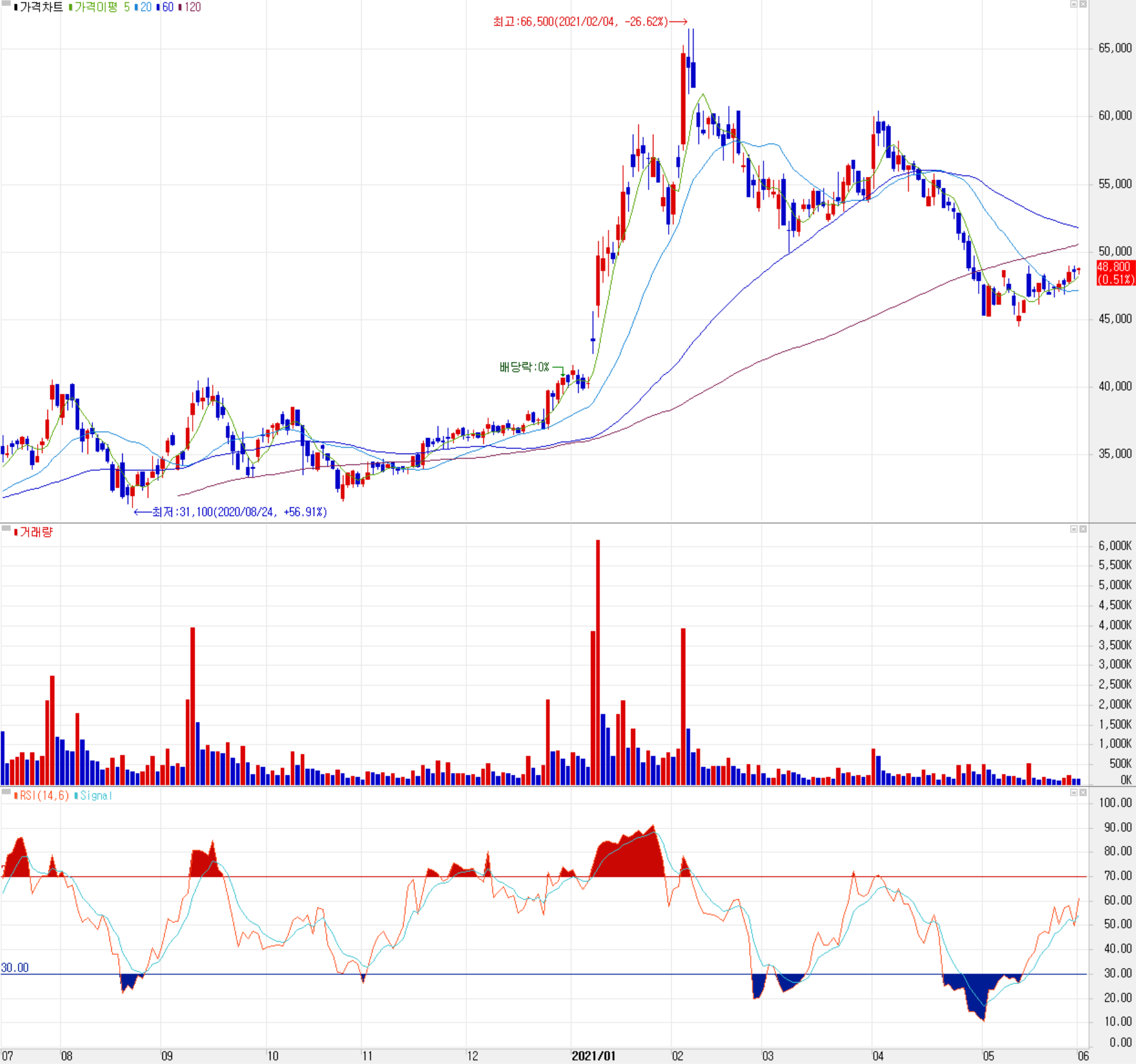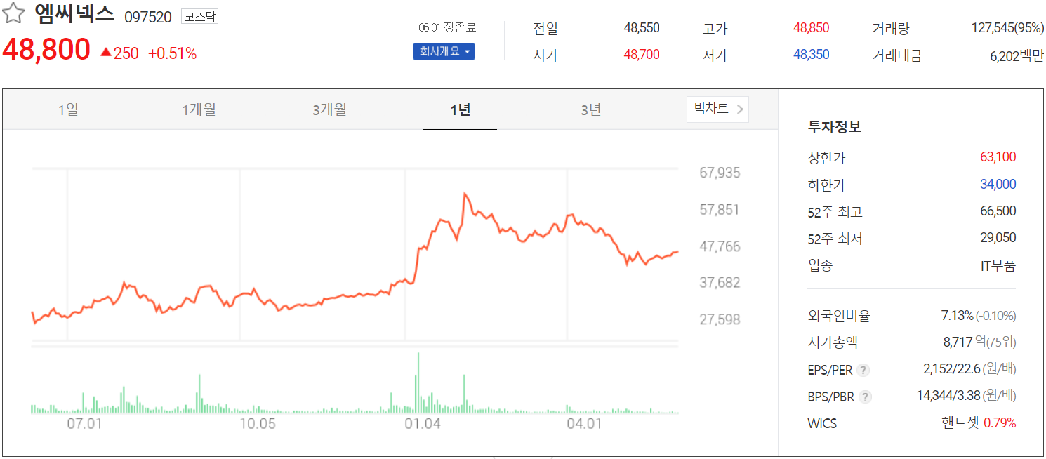 6월 1일 장 종료 기준 당사의 주가는 전일보다 0.51% 내린 48,800원에 마감되었습니다. 외국인 비중은 7.13%이며, 시가 총액 8,717억 원으로 코스닥 시총 75위 종목입니다.