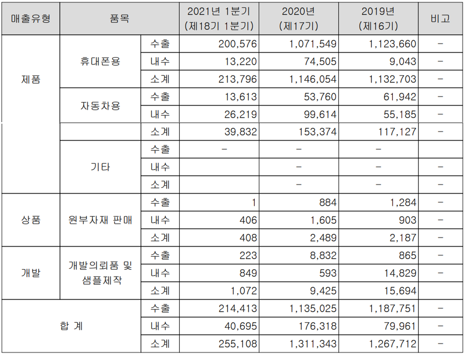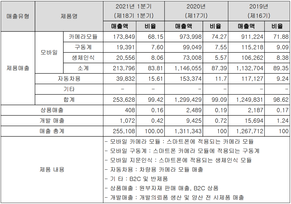 당사의 사업부문은 카메라 모듈 및 관련 응용 제품의 개발 및 생산을 영위하는 단일 사업부문으로 스마트폰 및 자동차용 카메라모듈과 기타 IP 카메라, 생체 인식 등으로 구분됩니다. 지난 1분기 당사의 주력 제품인 모바일용 카메라 모듈의 매출은 1,738억 원으로 전체 매출의 68.15%를 차지하였으며, 모바일용 구동계, 생체인식 등을 포함한 모바일 전체 매출은 2,138억 원으로 83.81%의 매출 비중을 나타냈습니다. 자동차용 카메라모듈은 매출액 398억 원으로 15.61%의 매출 비중으로 보였습니다.