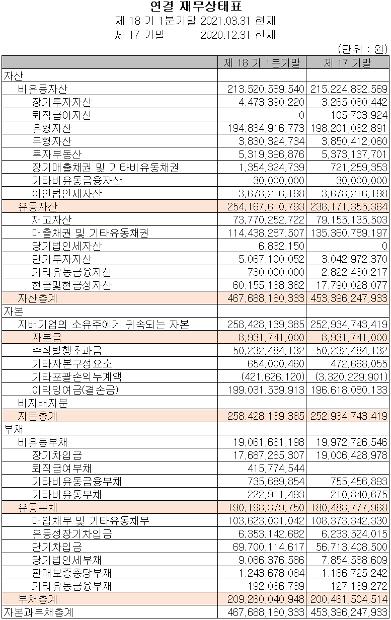 지난 1분기 자산총계는 전기보다 3.2%(143억 원) 증가한 4,677억 원으로 현금 및 현금성 자산의 증가에 기인합니다. 부채는 전기 대비 4.4% 증가한 2,093억 원으로 차입금의 증가가 주된 요인입니다.