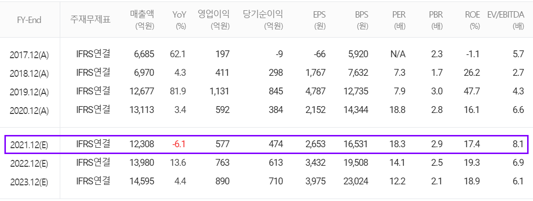 당사의 2021년 연간 예상 실적은 매출액 1조 2,308억 원으로 전년 대비 6.1% 감소하고, 영업이익은 577억 원으로 2.5% 감소할 것으로 추정했습니다.