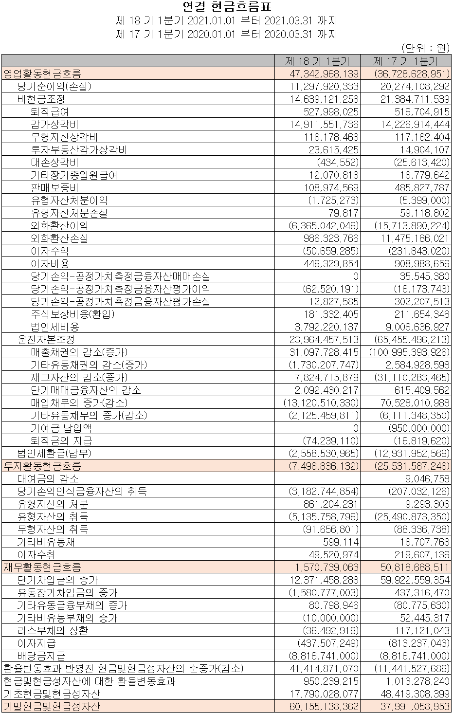 지난 1분기 영업활동 현금흐름에서는 총 473억 원의 현금이 유입되었으며, 장단기 차입금을 조달하여 부채를 상환하고 배당금을 지급하였습니다. 2021년 1분기 말 기준 현금 및 현금성 자산은 602억 원입니다.