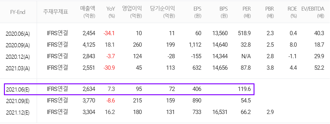 당사의 2021년 연간 예상 실적은 매출액 1조 2,308억 원으로 전년 대비 6.1% 감소하고, 영업이익은 577억 원으로 2.5% 감소할 것으로 추정했습니다.