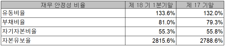 당사의 2021년 1분기 재무 안정성 비율에서는 유동비율 133.6%, 부채비율 81%, 자기자본비율 55.3%, 자본 유보율 2,815.6%를 기록하면서 양호한 재무구조를 유지하고 있습니다.