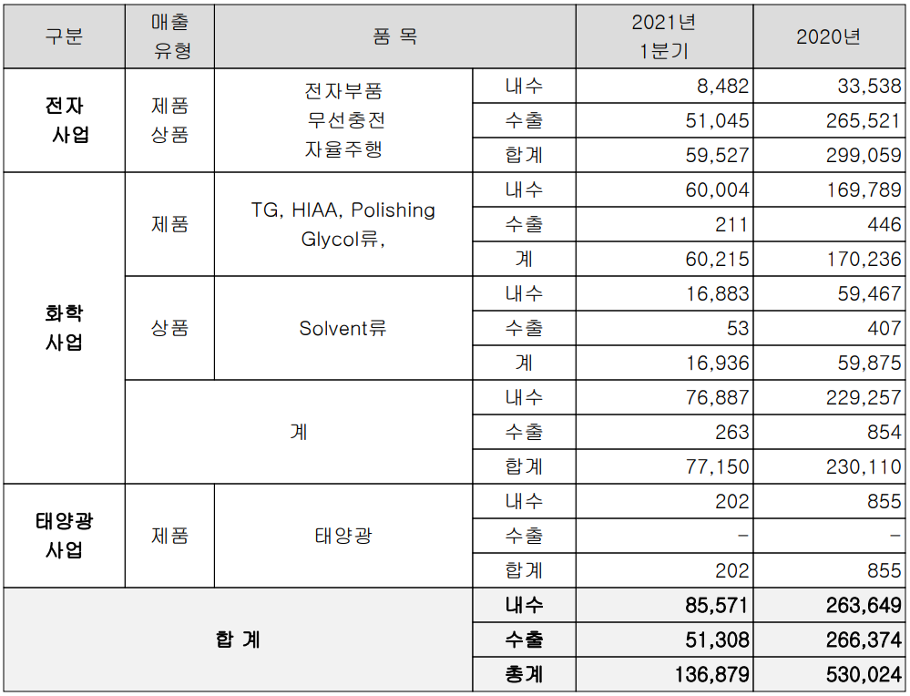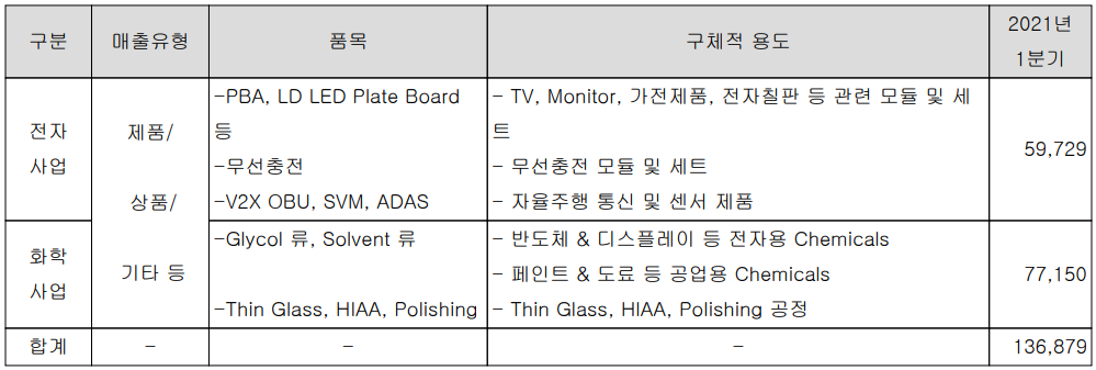 당사의 사업부문은 크게 가전제품과 자율주행 통신 밑 센서 제품 등을 제조, 공급하는 전자 사업부문과 반도체 및 디스플레이 제조 공정과 페인트 및 도료 등 공업용으로 사용되는 화학재료를 제조하는 화학 사업부문으로 구성되어 있습니다. 당사의 지난 1분기 전자 사업부문의 매출은 597억 원으로 전체 매출의 43.6%를 차지했으며, 화학 사업부문 매출은 772억 원으로 56.4%의 매출 비중을 나타냈습니다.