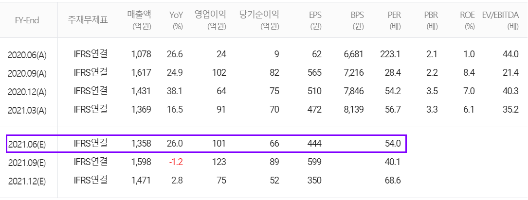 당사의 2분기 예상 실적은 매출액 1,358억 원으로 전년 동기 대비 26% 증가하고, 영업이익은 101억 원으로 321% 증가할 것으로 추정했습니다.