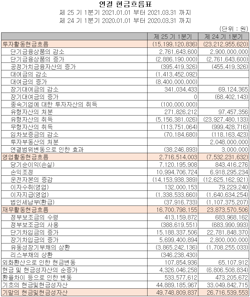 지난 1분기 당사의 영업활동 현금흐름은 유형 자산의 취득 등으로 인해 총 152억 원의 현금이 유출되었으며, 장단기 차입금을 조달하여 부채를 상환하였습니다. 2021년 1분기 말 기준 현금 및 현금성 자산은 전년 동기 대비 230억 원 증가한 497억 원입니다.