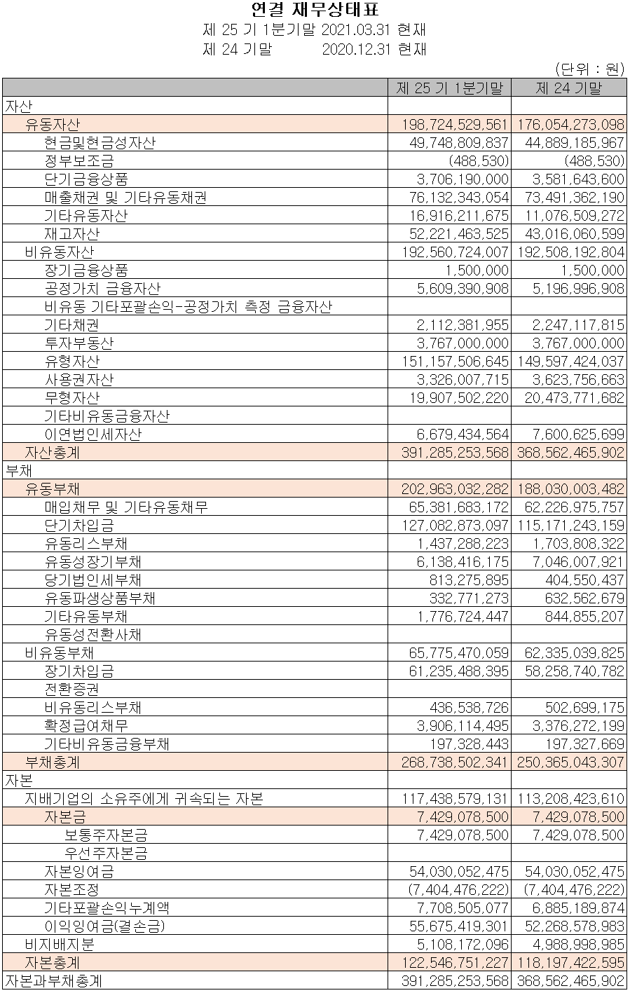 당사의 1분기 자산 총계는 전기 대비 7.9%(227억 원) 증가한 3,913억 원으로 현금성 자산, 재고 자산, 유형 자산 등의 증가에 기인합니다. 부채는 7.3%(184억 원) 증가한 2,687억 원으로 차입금 조달이 주요인입니다.