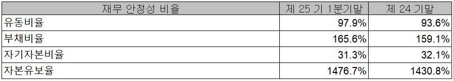 2021년 1분기 재무 안정성 비율에서는 유동비율 97.9%, 부채비율 165.6%, 자기 자본비율 31.3%, 자본 유보율 1,476.7%를 기록하였습니다. 부채비율이 다소 높지만 하반기부터 자율주행 ADAS 관련 매출이 가시화되는 등 지난 투자에 따른 실적 전망으로 점차 개선될 것으로 판단됩니다.