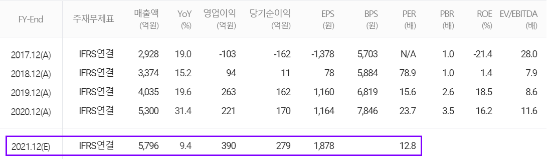 당사의 2021년 예상 실적에서는 매출액 5,796억 원으로 전년 대비 9.4% 증가하고, 영업이익은 390억 원으로 76.5% 증가할 것으로 추정했습니다.