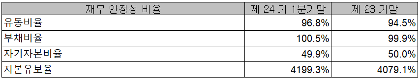 2021년 1분기 당사의 재무 안정성 비율에서는 유동비율 96.8%, 부채비율 100.5%, 자기자본비율 49.9%, 자본 유보율 4,199.3%를 기록하였습니다. 카메라 모듈 사업의 인수로 부채가 증가하였으나 실적 개선에 따른 재무상태의 개선이 있을 것으로 예상됩니다.