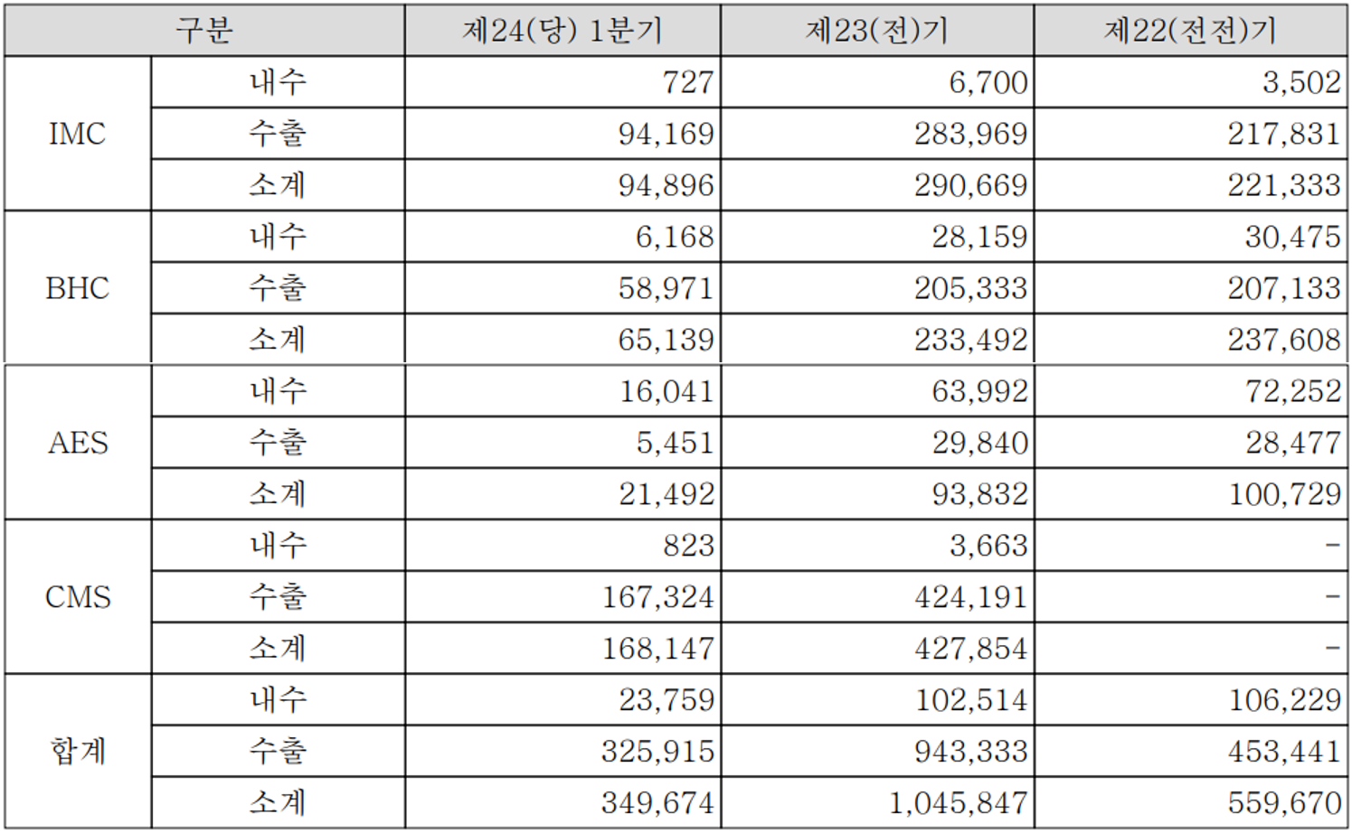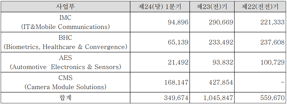 당사의 사업부문에는 스마트폰과 IT 관련 모듈을 제조하는 IMC 사업부, 지문인식 모듈 및 Convergence 솔루션을 제공하는 BHC 사업부, 차량용 LED 모듈 및 센서 등을 공급하는 AES 사업부 그리고 스마트폰 카메라 모듈을 제조 공급하는 CMS 사업부문으로 구분됩니다. 지난 1분기 IMC 사업부문의 매출은 949억 원으로 전체 매출의 27.1%를 차지하였으며, BHC 사업부문은 매출액 651억 원으로 18.6%, AES 사업부문은 214억 원으로 6.1% 그리고 지난해 나무가 인수로 사업을 시작한 카메라 모듈 사업의 매출은 1,681억 원으로 전체 매출의 48% 비중을 나타냈습니다.