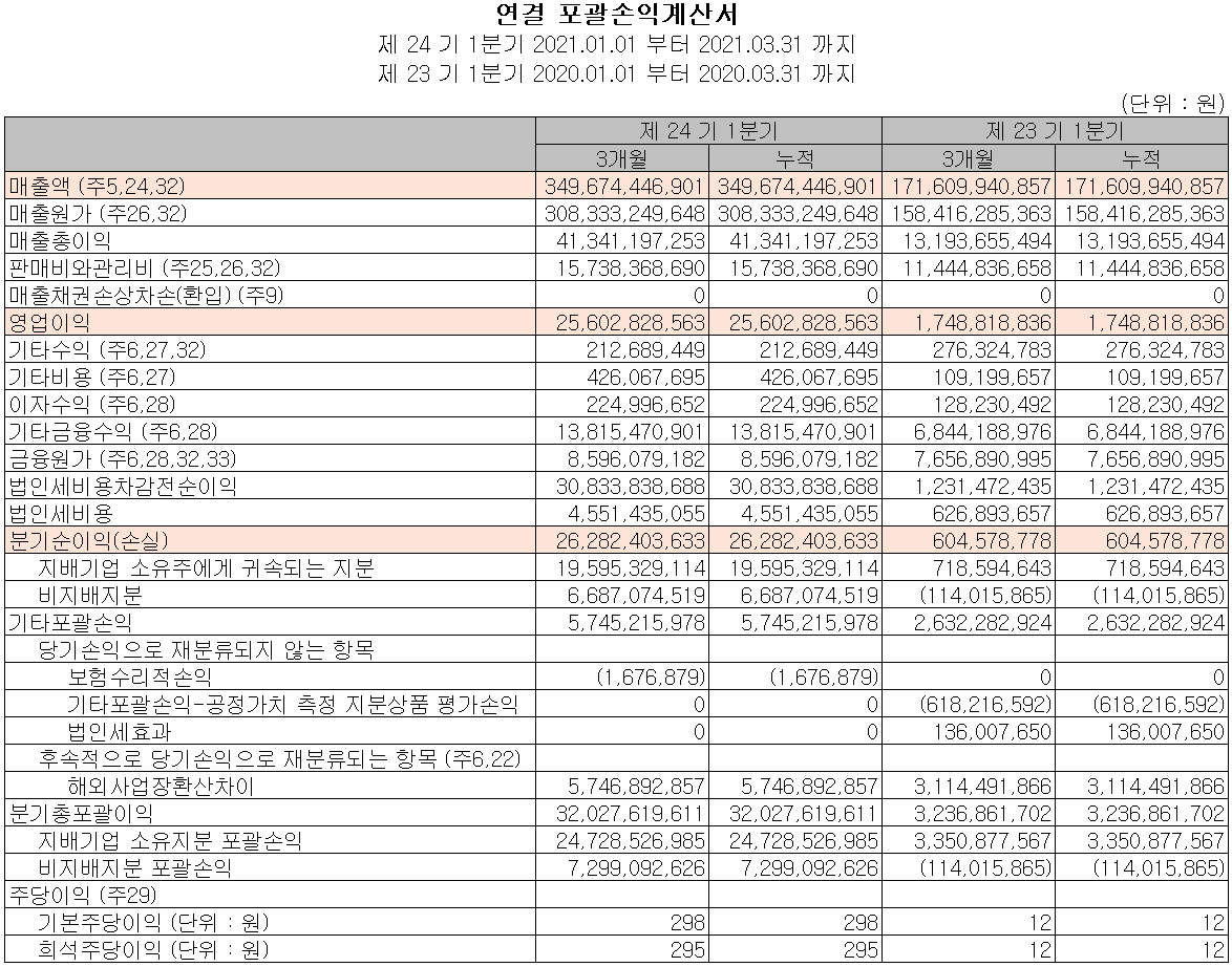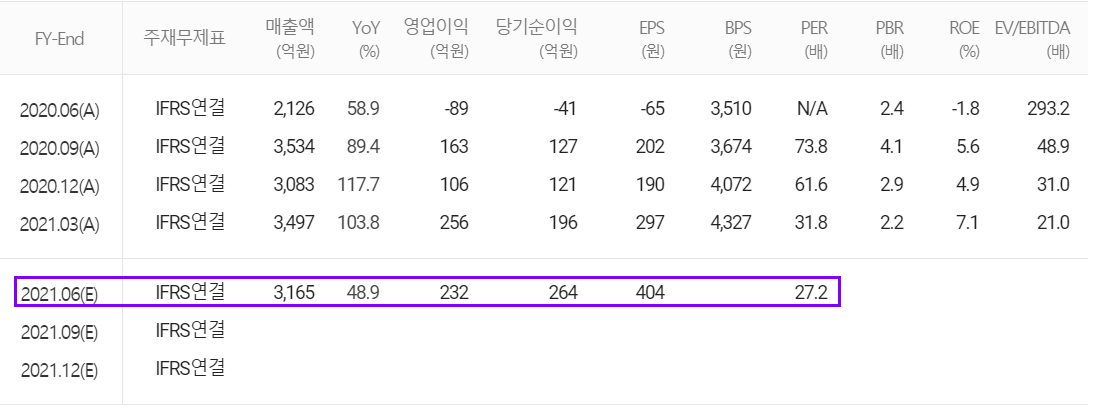 당사의 2021년 2분기 예상 실적은 매출액 3,165억 원으로 전년 동기 대비 48.9% 증가하고, 영업이익은 232억 원, 당기순이익 264억 원으로 흑자 전환을 추정했습니다.