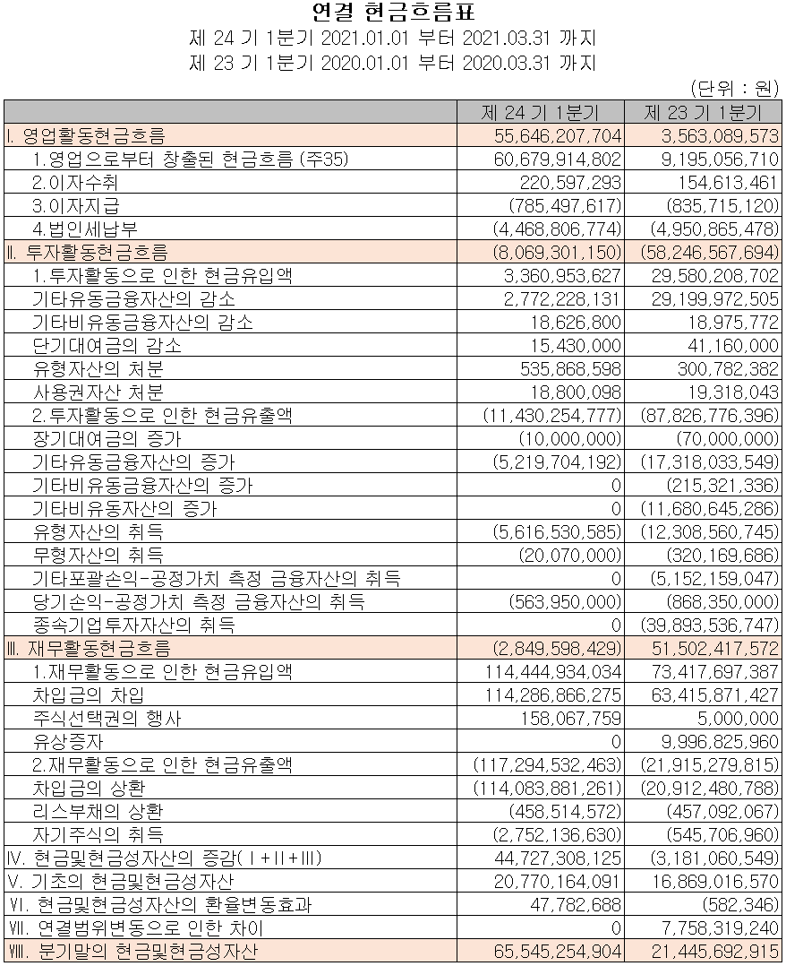 지난 1분기 영업활동 현금흐름은 총 556억 원의 현금이 유입되었으며, 차입금을 조달하여 부채를 상환하고 주주가치 제고를 위한 자기 주식을 취득하였습니다. 유무형 자산의 취득 등 투자활동 현금흐름에는 81억 원의 현금이 유출되었습니다. 2021년 1분기 당사의 현금 및 현금성 자산은 전년 동기보다 441억 원 증가한 655억 원입니다.