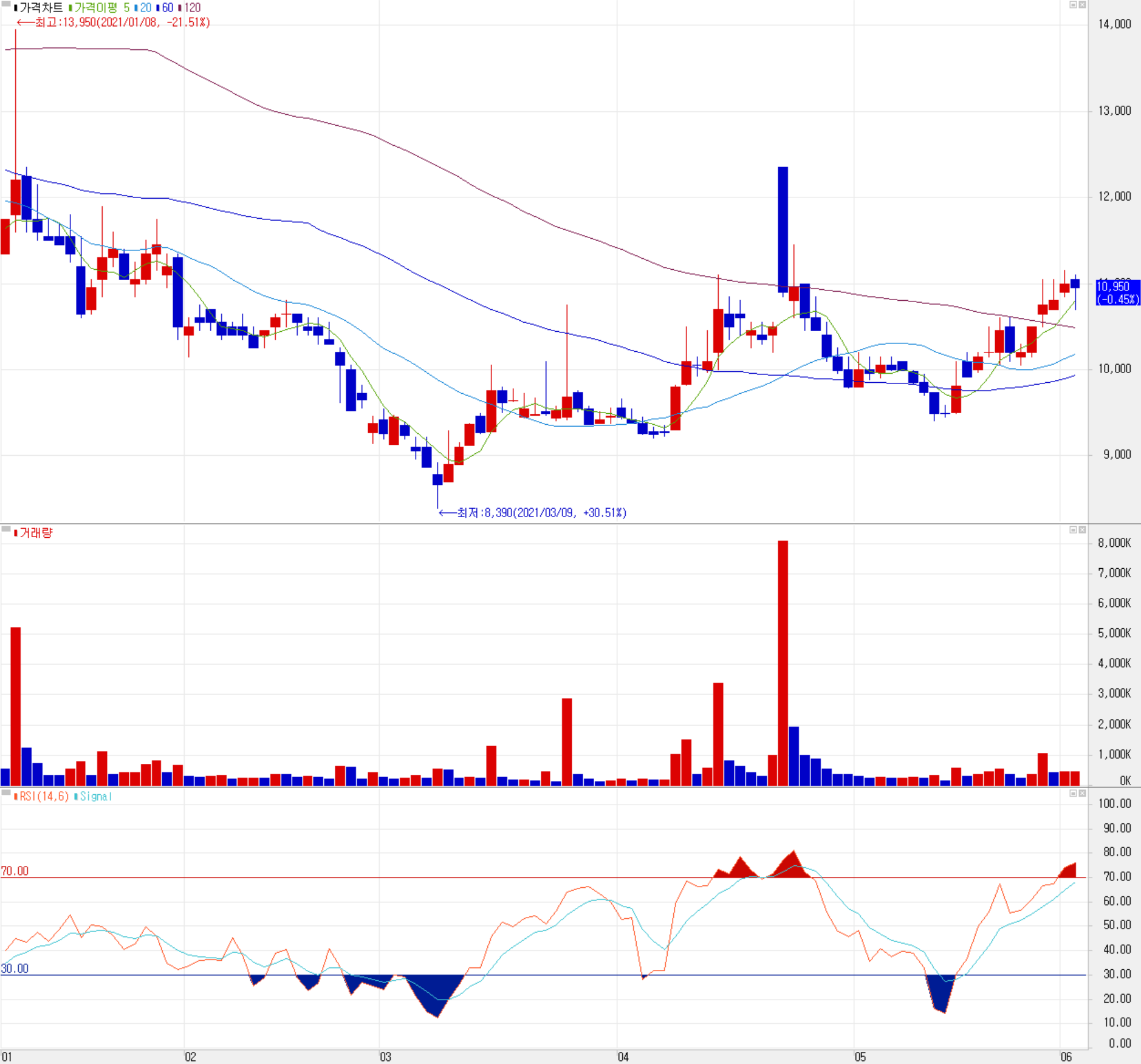 올해 당사의 주가는 3월 9일 저점을 기록한 후 등락을 반복하면서 최근에는 5일 선위에서 상승 추세를 보이고 있습니다. 최근 한 달간 수급에서는 외국인의 매수에 개인은 매도로 맞서고 있으며, 기관의 거래는 둔화된 모습입니다. 예상 실적 및 차트소견상 개인적인 목표주가는 지난번 보다 소폭 하향한 13,000원으로 설정하였습니다.