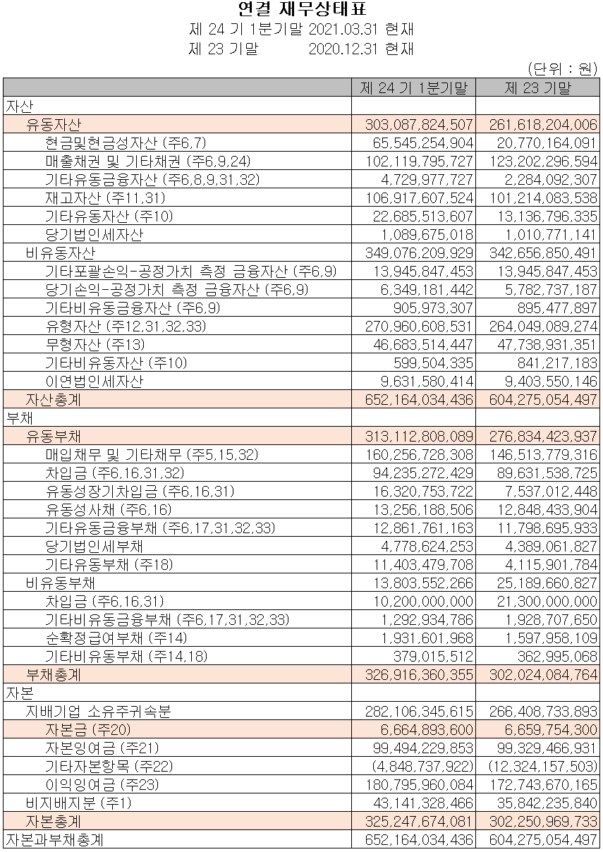 지난 1분기 당사의 자산총계는 전기보다 7.9%(479억 원) 증가한 6,522억 원으로 현금 및 현금성 자산, 재고 자산 및 유형 자산의 증가가 있었습니다.