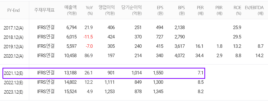 당사의 2021년 연간 예상 실적에서는 매출액 1조 3,188억 원으로 전년 대비 26.1% 증가하고, 영업이익은 901억 원으로 357.4% 증가할 것으로 추정했습니다.