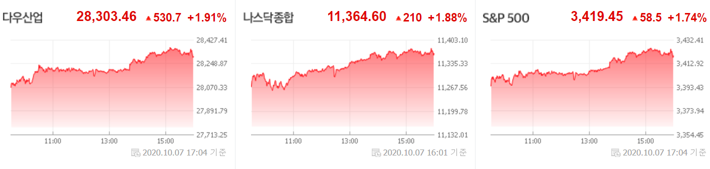 지난밤 뉴욕 증시는 트럼프 대통령의 경기 부양안 일부 승인에 힘입어 3대 지수가 일제히 상승했다는 보도 일색이었습니다. 게다가 지난주까지 미국 대선에 대한 불확실성이 어느 정도 바이든 후보의 승리로 기울어졌다고 보는 시각도 많습니다. 또한 이에 따른 바이든 후보의 공략 중 하나인 신재생에너지 관련 종목들이 강세를 보이고 있습니다. 아무튼 당분간의 여론조사의 추이에 따라 하루하루 변동성을 보일 것으로 예상됩니다.