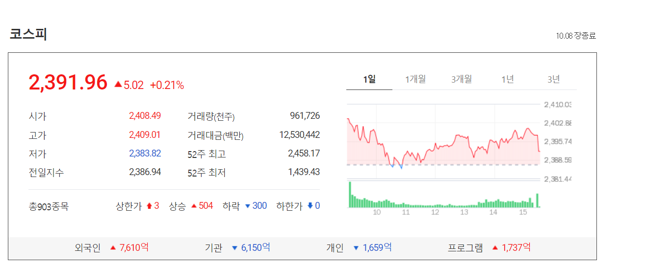 오늘 코스피는 2400선을 넘어서 시작했으나 장초반 부터 하락과 상승을 반복하는 소폭의 변동성을 보이다가 5.02포인트(0.21%) 오른 2391.96으로 마감했습니다.