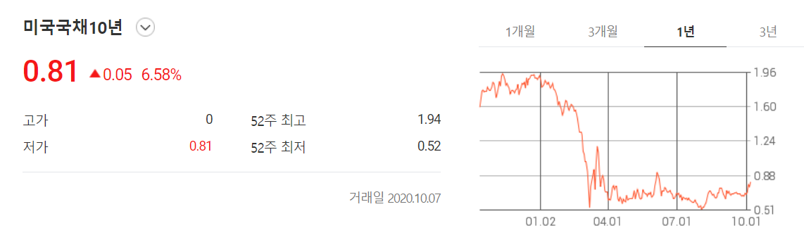 미국 국채 10년 금리 - 전 거래일 대비 0.05포인트(6.58%) 오른 0.81