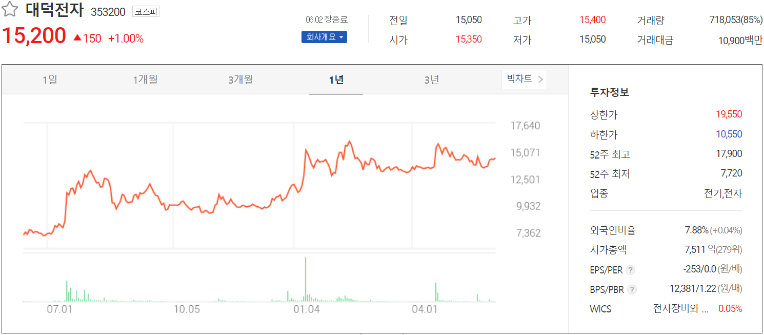 6월 2일 장 종료 기준 당사의 주가는 전 거래일보다 1% 오른 15,200원에 거래를 마감했습니다. 외국인 비중은 7.88%이며, 시가 총액은 7,511억 원으로 코스피 시총 상위 279위 종목입니다.