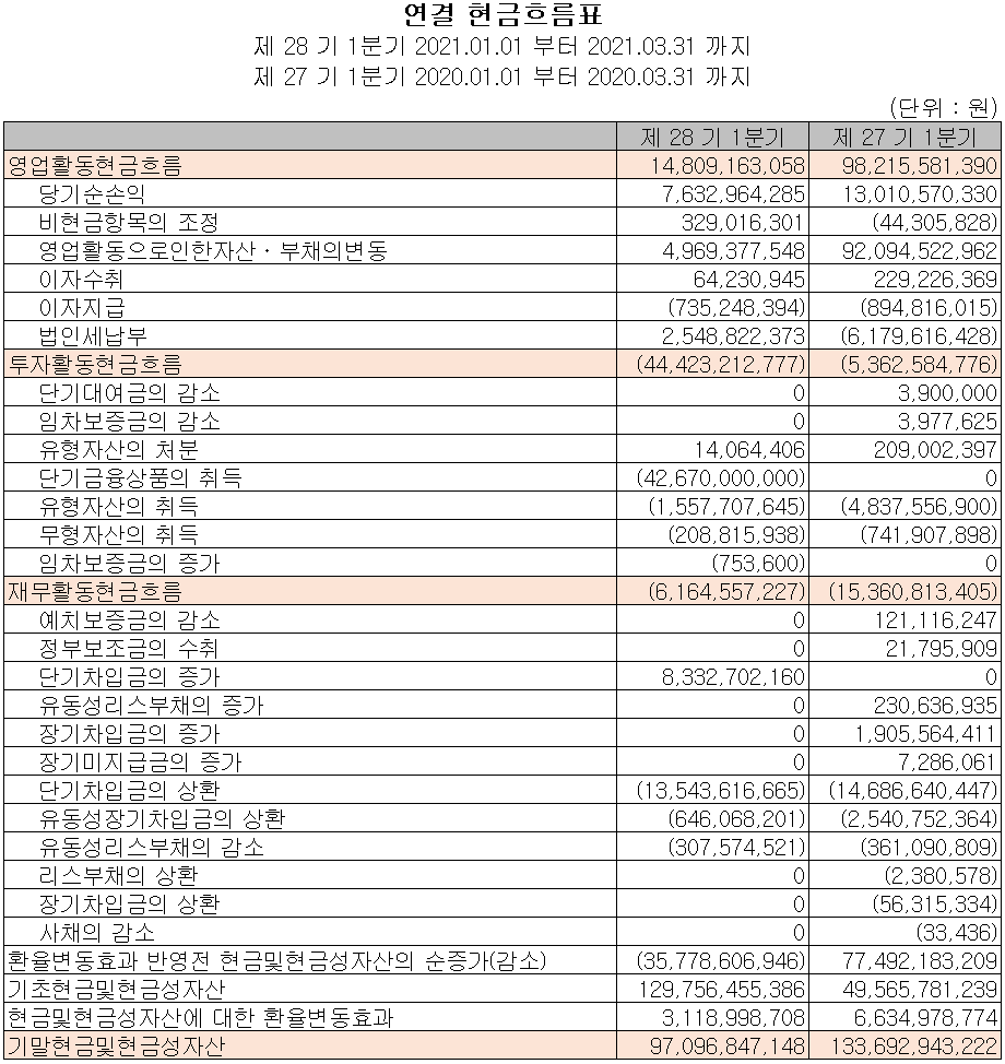 지난 1분기 영업활동 현금흐름은 총 148억 원의 현금이 유입되었으며, 차입금을 조달하여 부채를 상환하고유형자산을 취득했습니다. 2021년 1분기 말 기준 현금 및 현금성 자산은 전년 동기보다 366억 원 감소한 971억 원입니다.